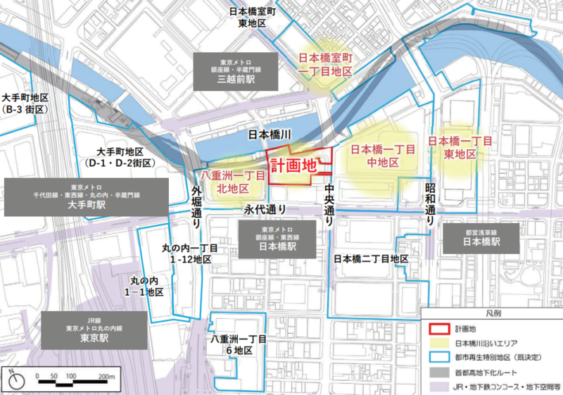 コレド日本橋に隣接する約3.0haの土地で「日本橋一丁目中地区第一種市街地再開発事業」が進行中。