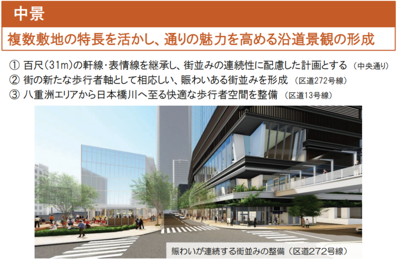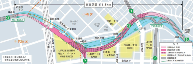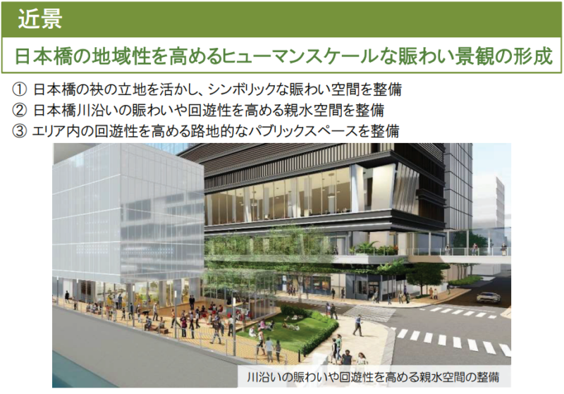 - 日本橋川沿いの再開発と首都高速道路の地下化により、広大な親水空間が創出されます。
